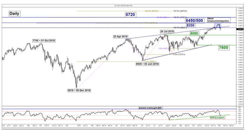 美国科技100指数(纳斯达克100期货的代表)过去两天开始转跌,受美国总统特朗普近期“关税人”(也就是贸易保护主义)立场及中美关系动态的影响,股指自2019年11月27日创下的当前历史高点8454下跌了3.4%。