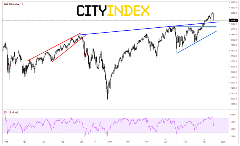 尽管标普500指数两天内下跌了近80点,但仍有探向3065的空间,此处为2018年9月以来上倾趋势线所在位置。略下方3060附近也有水平支撑。心理阻力现回到3100,然后240分钟图上水平和趋势线阻力落在3113附近。
