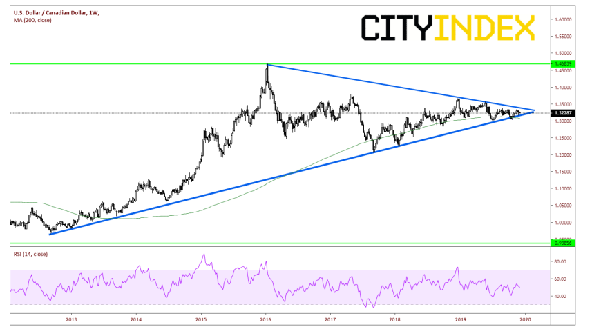 许多人认为这三个北美国家之间的贸易协定可能成为将美元/加元推出长线三角的催化剂,但事实似乎并非如此。货币对仍越来越接近狭窄区间的顶点。