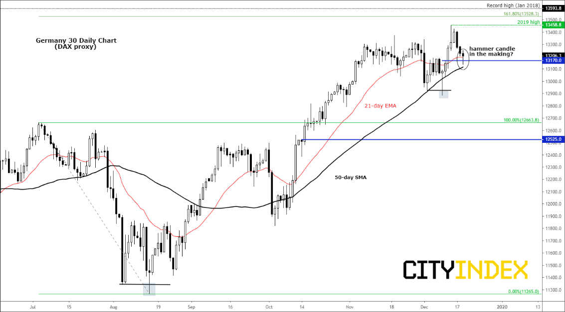 事实上,从技术面角度看,DAX指数目前表现良好,牢牢守住50天和200天(图中未显示)等主要均线上方。该指数其实今天已于移动更为迅速的21天指数均线和13170附近支撑获撑。若该股指期货今天晚上继续推高,那么我们最终将看到的是一条类锤子线。随着圣诞节和年底的临近,该形态或触发新的上行动量。在到达13596前历史高点之前,有几个水平值得关注,其中包括上周高点,即13460略下方当前2019年高点,以及紧随其后的13530略下方161.8%的扩展位。