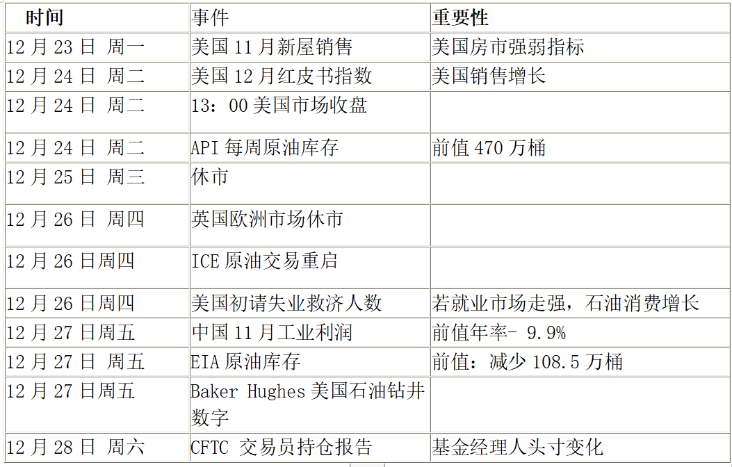 下周将有少量(主要是美国和加拿大)经济指标出炉,但英国、欧洲和亚洲大部分地区市场活跃性将逐渐减弱,这些地区的节日余波影响要等到明年1月第二周才会淡出。