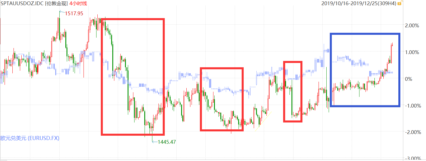伦敦金现货/EURUSD H4级别叠加 数据来源:wind