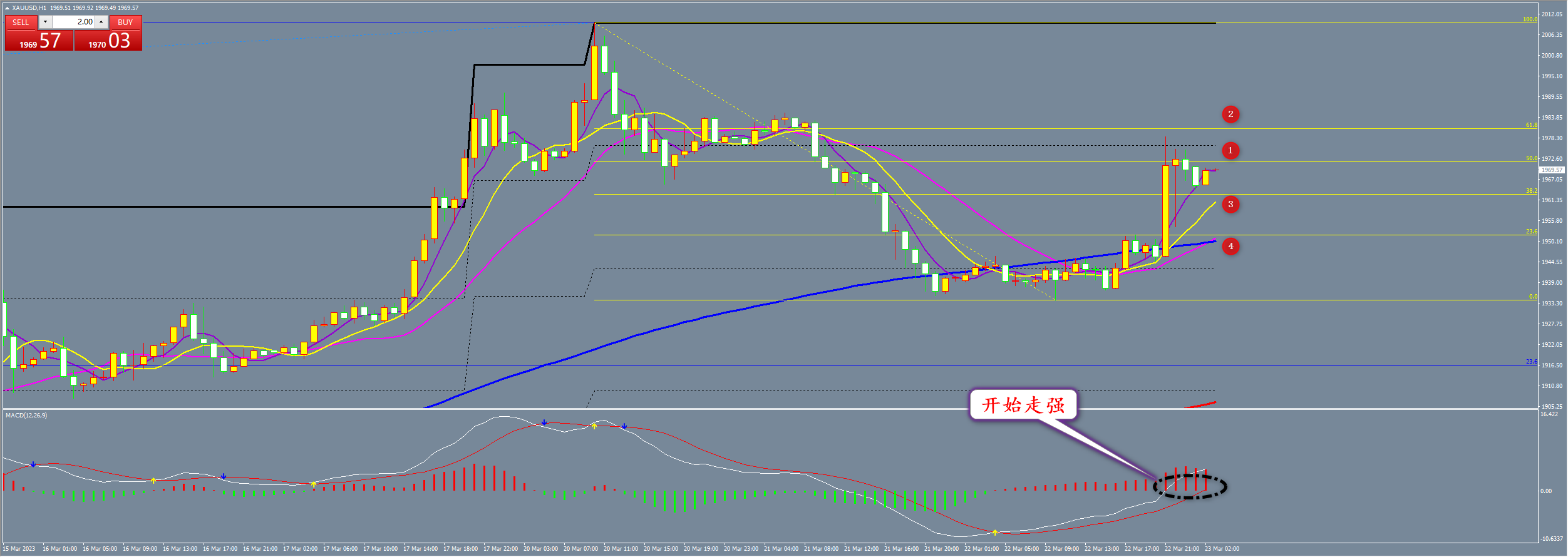 通过对黄金小时图解析得知,昨日行情如期反弹上涨,晚间冲击到1978一线冲高回落,从下方的MACD来看已经开始进入强势区运行,昨日白天开始多头能量柱不断的增加虽然盘中有回调动作主要目的就是为了更好的反弹上涨晚间借助数据拉升脱离底部区域,目前有进一步实现突破的可能性,从黄金分割率来看短期上方1和2一线已经成为主要的压力,下方3和4也就是短期的支撑,比较上方的重压区还没有完全放量突破并且站稳,在操作上我们先高空低多思路,具体建议如下: