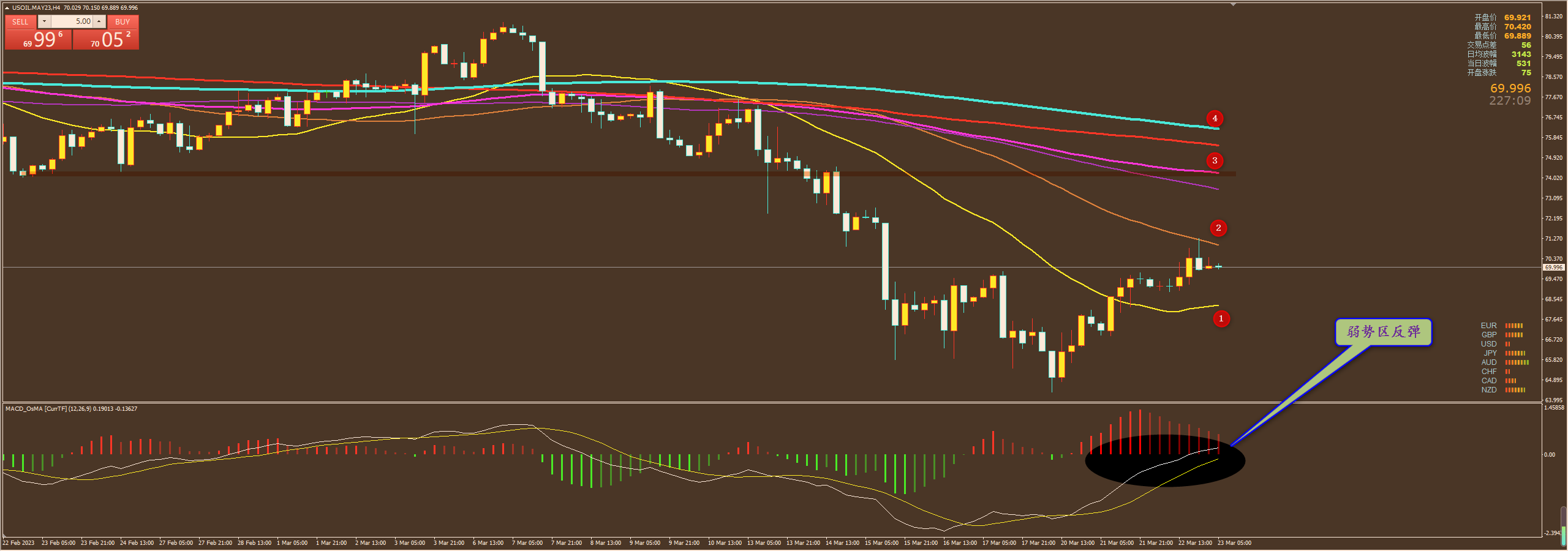 通过对原油4小时图解析得知,昨日行情继续延续反弹动作,晚间一度反弹到上方2号均线压力位冲高回落,从下方的MACD来看目前整体依然是在零轴下方运行,红色多头能量柱在反弹的过程中逐步处于缩短的迹象说明多头力道的衰竭,主图的均线系统依然是空头排列但是不排除进一步的反弹上方我们继续重点关注2,34号均线的压制即可,短期重点还要看回落下方1号均线支撑的有效性,在操作上我们继续重点逢高做空思路不变,具体建议如下: