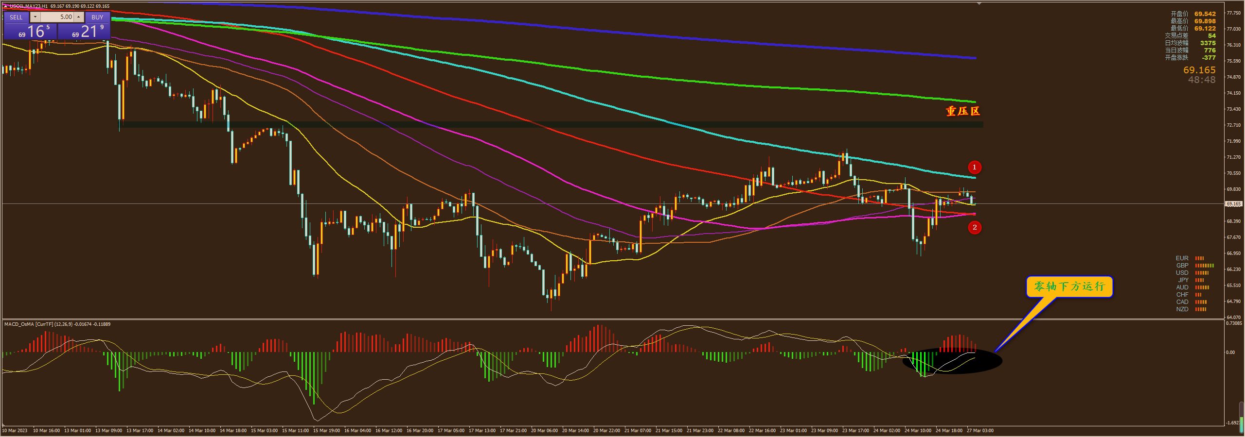 通过对原油小时图解析得知,上一个交易日先涨后跌再上涨,形成震荡下行走势,从下方的MACD也可以清楚的看到星期五晚间反弹那么多几乎快要把星期五的下跌收复回来但是整体依然是在零轴下方运行说明依然是属于弱势反弹阶段,上周五就已经说过短期上涨已经遭到破坏并且上方均线已经构成短期压制,但是不排除受到消息影响进一步的反弹,上方我们重点关注前期反弹的高点以及上方的均线重压区间,小妹认为进一步震荡下行的可能性比较大一点,下方我们重点关注2号均线的支撑即可(68.60一线),在操作上我们继续高空低多思路,重点逢高做空,具体建议如下: