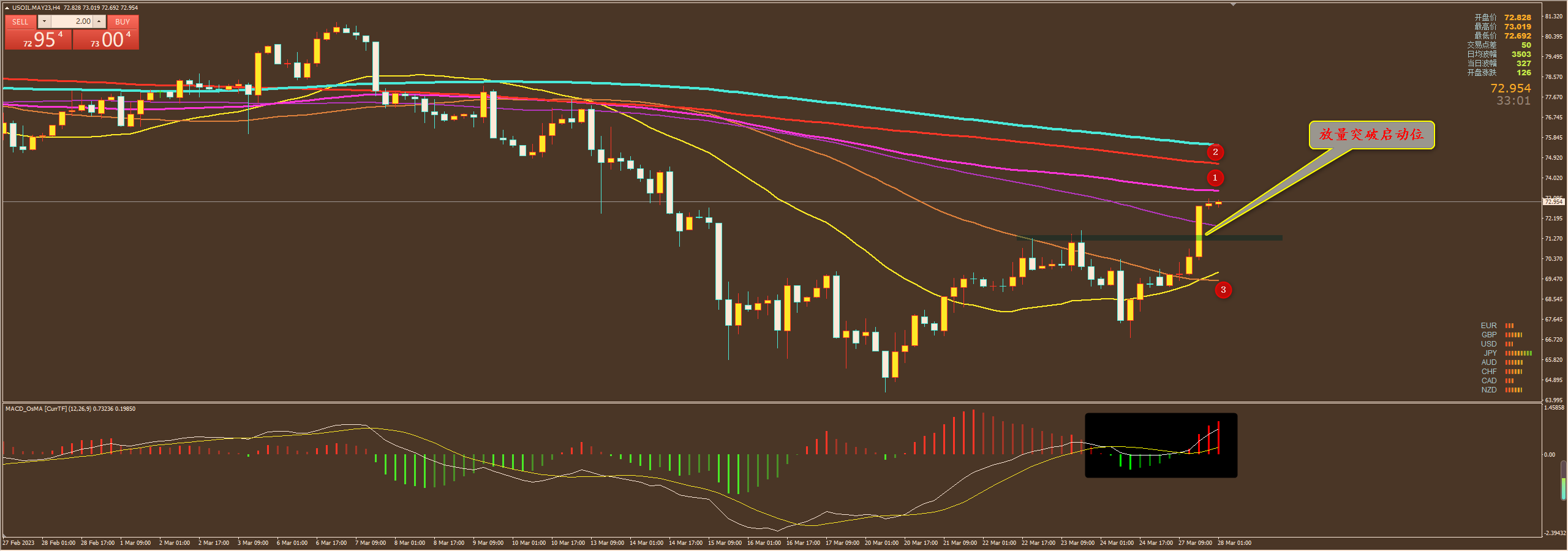 通过对原油4小时图解析得知,昨日行情进一步放量突破前两天的反弹高点,短期反过来已经成为支撑(71.10一线),从下方的MACD来看昨日已经在零轴附近形成金叉昨日晚间再次放量突破阻力位,目前即将到达上方12号均线的压力位相对而言也是有一定的压制作用毕竟均线系统依然是处于空头排列,技术上还有反弹要求,下方我们重点关注昨日放量突破的位置以及下方3号均线的支撑,在操作上我们继续高空低多思路,具体建议如下: