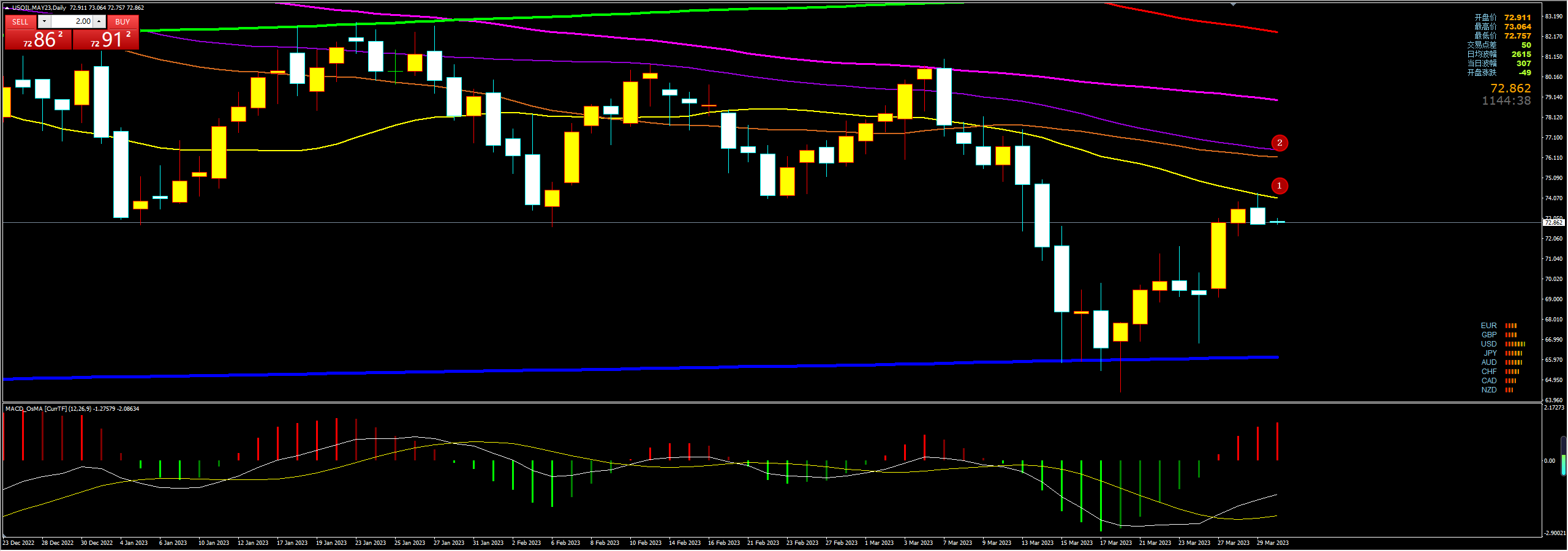 原油74.00和76.00分别做空,止损各70点,止盈各200点;
