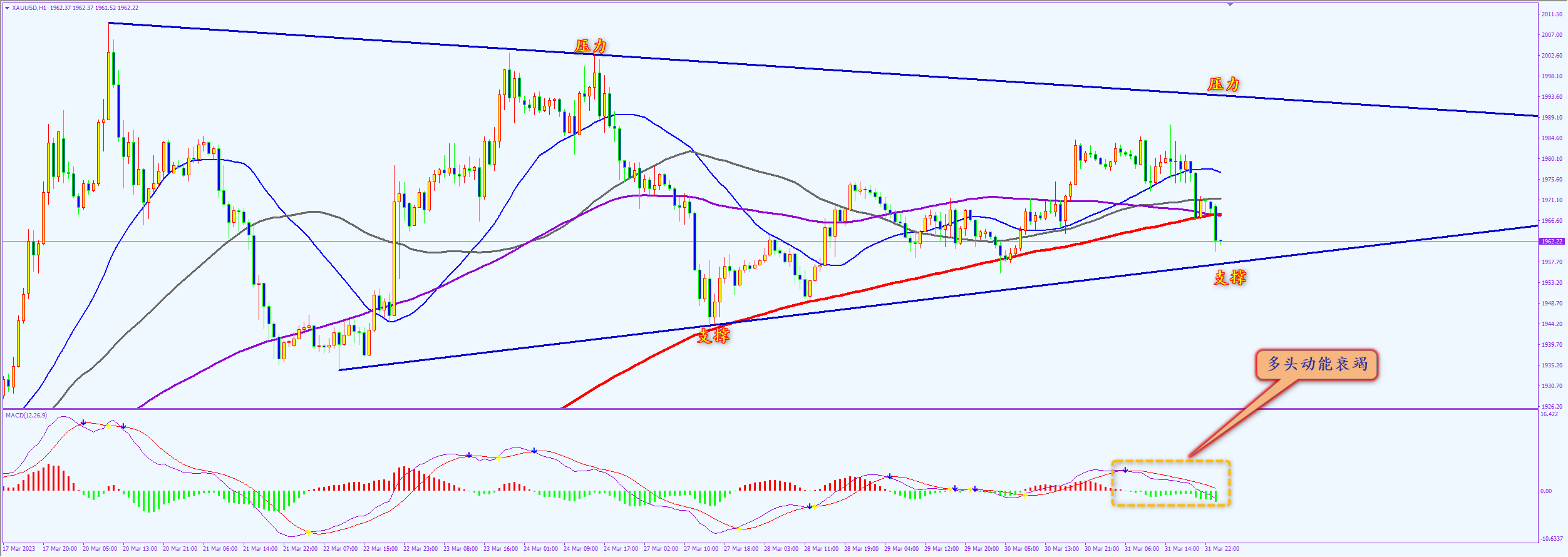通过对黄金小时图解析得知,昨日行情如期冲高回落早盘一度放量跌破年线支撑位,即将到达下方上升趋势线的支撑位同时也是这次启动上涨的位置相对而言有一定的支撑作用,从下方的MACD来看多头动能表现衰竭,空头动能处于逐步放大迹象有进一步回落的可能性,我们重点关注下方上升趋势线支撑的有效性即可,短期上方我们继续重点关注下降趋势线的压制即可,短期在操作上我们继续高空低多思路,具体建议如下: