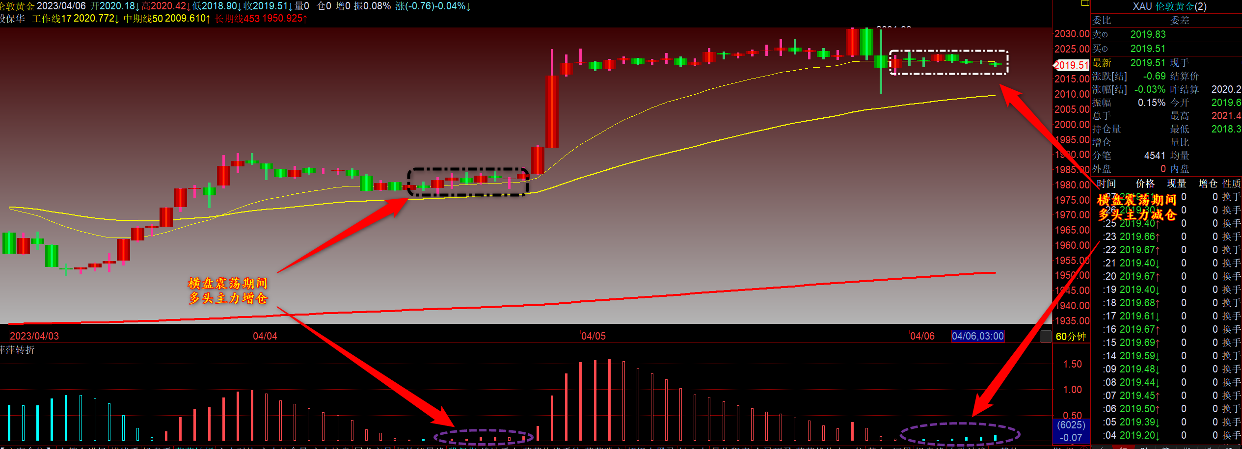 通过对黄金小时图解析得知,昨日黄金冲高回落继续回归窄幅震荡走势,行情之所以止跌涨跌其实和市场参与资金的力度关系比较大一点例如昨日正常上涨的过程中突然连续3单巨单砸盘造成行情的扭转,我们也可以通过下方的幅图也可以清楚的看到前期在启动之前横盘震荡调整期间多头主力不断的开始建仓介入晚间大单拉升,昨日也是这种情况在高位出现了多头主力出逃迹象,晚间拉升诱多,随之连续砸盘动作非常明显主力要收割全世界,目前再次出现横盘震荡调整期间空头主力不断的增仓,说明行情将会进一步的回落调整,虽然大方向上涨不变,但是由于多头主力资金的出逃道指上涨力道的衰弱,短期在操作上我们继续高空低多思路,具体建议如下: