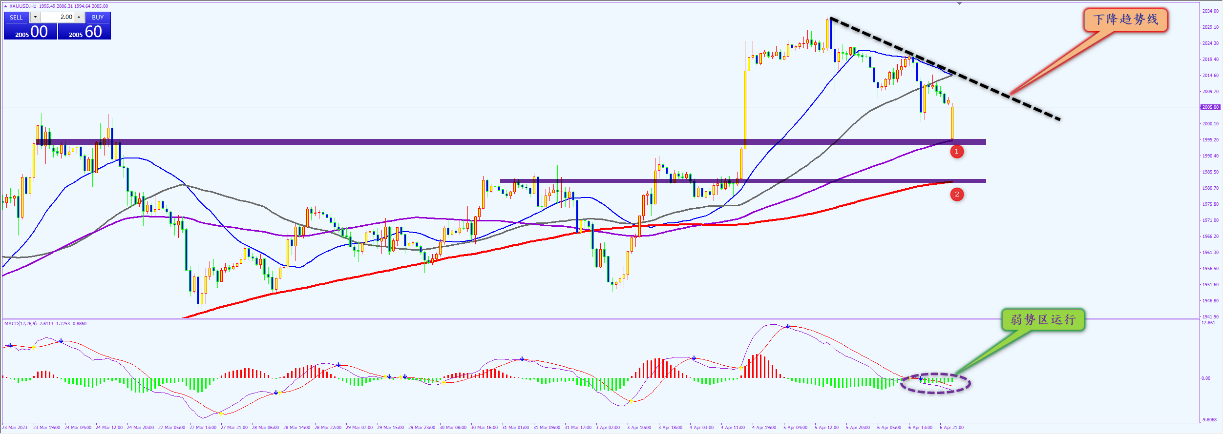 通过对黄金小时图解析得知,是一个交易日继续延续震荡调整下行走势从反弹的力度来看力度明显的不足今日早盘再次延续下跌调整走势,早盘一度到达下方1号均线支撑位有所反弹同时也是前期反弹顶部的支撑,盘中不排除进一步的回落调整到达下方2号支撑位,从下方的MACD也可以清楚的看到目前已经在零轴下方运行,虽然动能柱有所缩短形成底背离迹象非常有可能短期调整到位进一步回归超强势走势,短期上方我们重点关注上方下降趋势线的压力,短期在操作上我们继续高空低多思路,具体建议如下:
