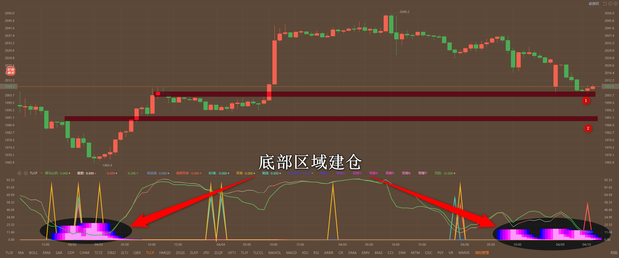 通过对黄金小时图解析得知,行情从早盘到现在目前为止先跌后涨再下跌到达下方1号支撑位目前有所反弹,从下方的附图我们可以清楚的看到目前已经再次出现多头主力建仓信号,在前期低点位置出现多头主力建仓信号形成一波强有力的上涨一口气到达上方2032一线,今日在下方1988再次出现多头主力建仓信号,目前还没有建仓完毕还需要进一步的观察,短期小阿枫我们继续重点关注12号前期启动的支撑位,在操作上我们可进行布局操作,具体建议如下:
