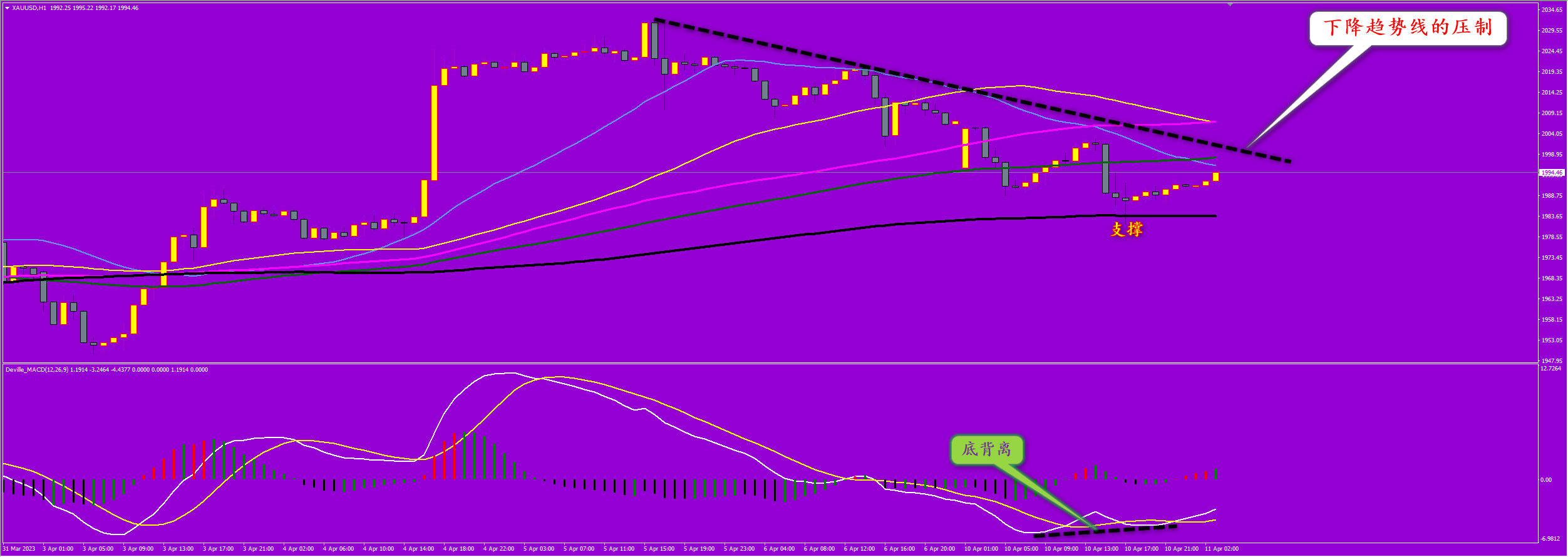 通过对黄金小时图解析得知,昨日行情继续延续下跌走势到达下方年线支撑位得到有效支撑反弹目前依然处于反弹过程中从的下方的MACD来看到达下方年线支撑位附近已经出现了底背离迹象从而导致行情的一波反抽动作,但是从反弹的力度来看还没有昨日的下跌全部收复回来说明短期的反弹力度不足,加上上方一直受到下降趋势线的压制以及2007一线均线的压制,短期到目前为止还没有形成上涨节奏还需要进一步的回调确认下方年线支撑的有效性短期冲高回落的可能性比较大一点,短期在操作上我们先继续高空低多思路,具体建议如下: