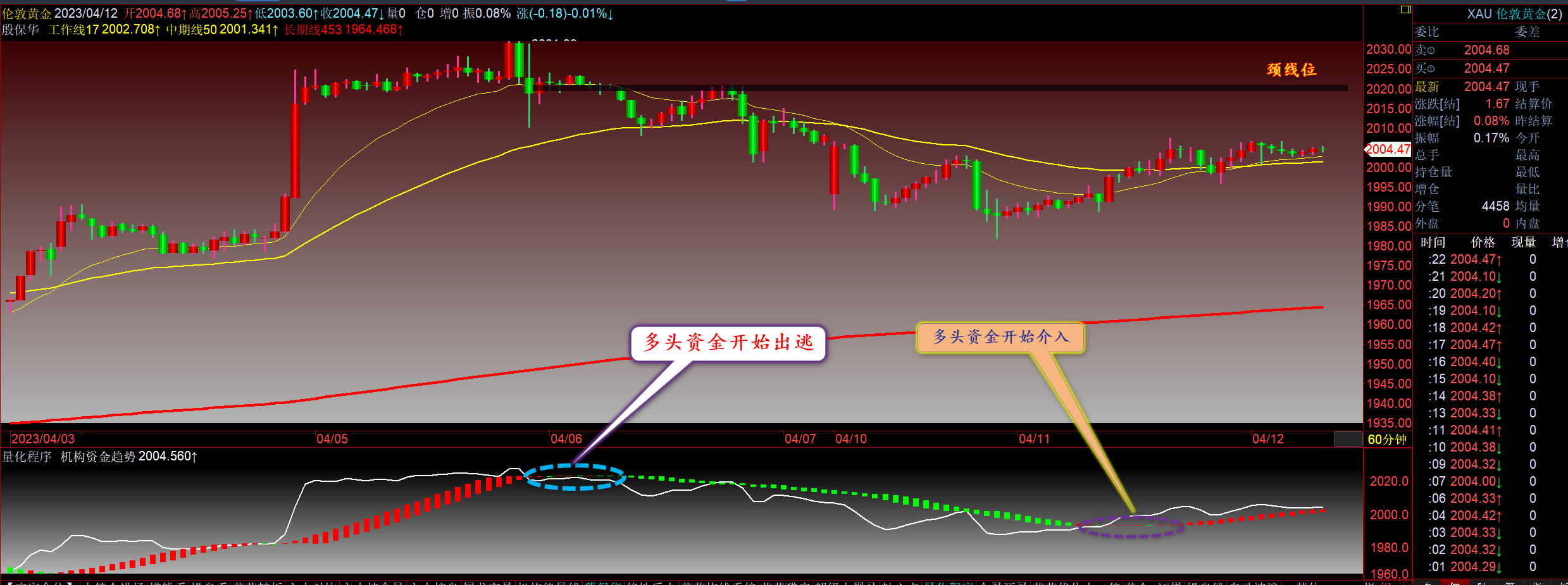 通过对黄金小时图解析得知,昨日行情如期继续震荡上行,但是到目前为止还没有出现合力上涨还需要进一步确认下方支撑的有效性,但是我们从下方幅图可以清楚的看到前期行情在高位之所以进一步的调整,在顶部区域出现了大量的多头主力出逃迹象从而导致行情进行了50美金的调整空间,目前我们也可以清楚的看到多头主力不断的进仓有继续加大力度进仓迹象,上方我们继续重点关注前期反弹的颈线位的压制2022一线,一旦放量突破并且站稳行情将会加速拉升,短期继续震荡调整为拉升突破做准备,短期在操作上我们继续高空低多思路,重点逢低做多,具体建议如下: