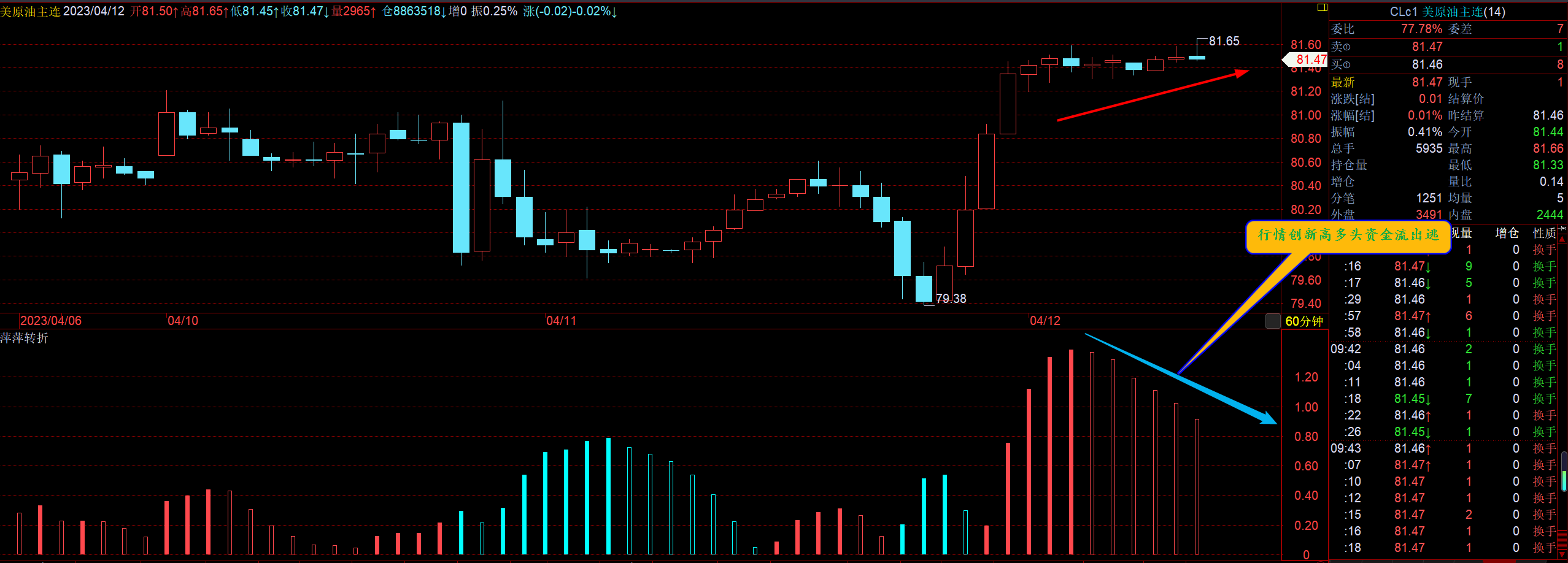 通过对原油小时图解析得知,昨日行情先跌后涨晚间一度到达上方81.60一线,目前有所回落,从昨日的整体走势来看完美形成诱空动作,多头主力立马掉头向上运行,从下方的附图我们可以清楚的看到昨日早盘多头主力资金表现的唯唯诺诺晚间绝地而起,目前行情创新高而多头主力资金流呈现出逃迹象,行情非常有可能冲高回落,我们在操作上继续高空低多思路,具体建议如下: