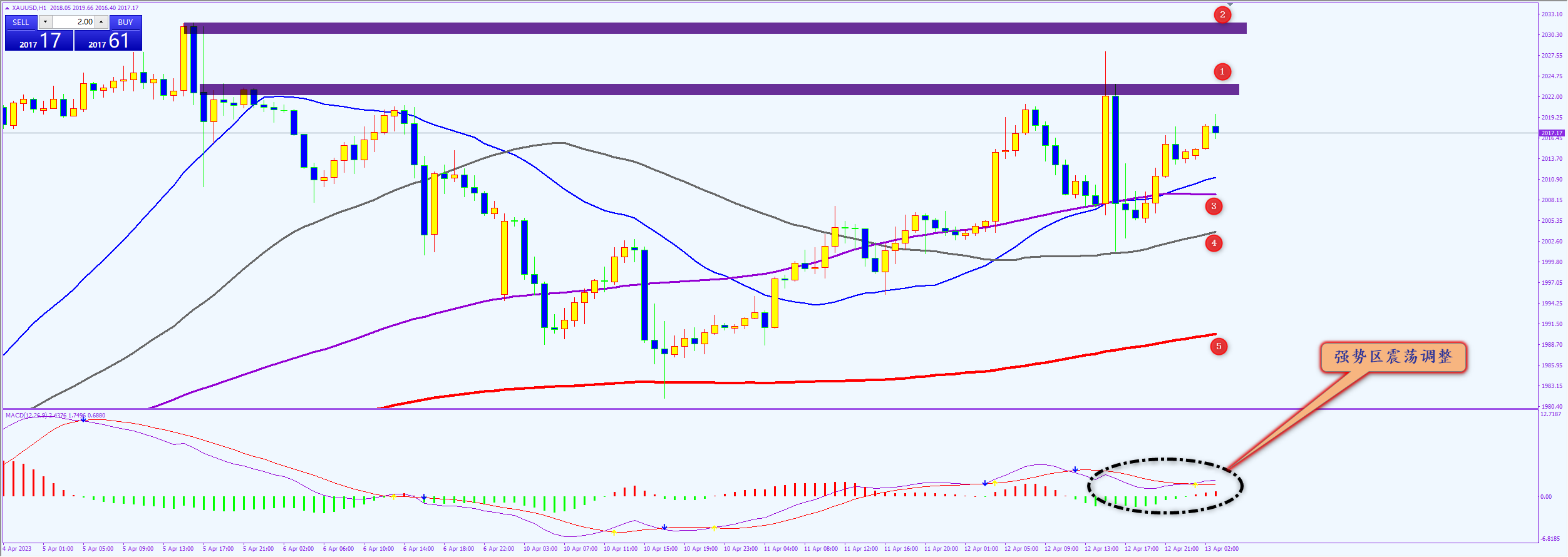 通过对黄金小时图解析得知,昨日行情先涨后跌再上涨在高位形成剧烈震荡,盘在一度放量突破1号平台的压制,随之在上方2029一线冲高回落,晚间到达4号均线支撑位反弹上涨,从下方的MACD也可以清楚的看到再次形成金叉多头主力在强势区完成调整动作有进一步震荡上行突破需求,短期上方我们继续重点关注12号的压制以及下方345号均线的支撑,在操作上我们继续高空低多思路,重点逢低做多,具体建议如下: