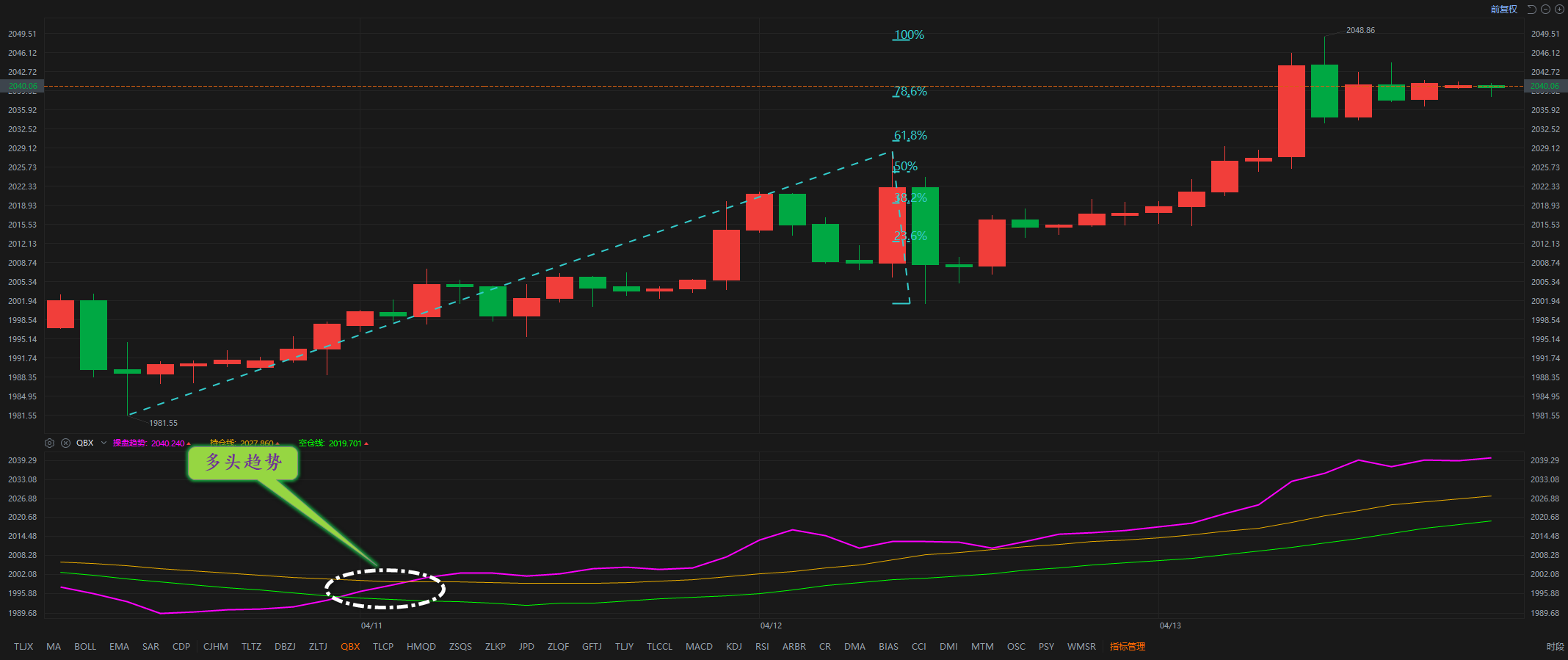 通过对黄金小时图解析得知,昨日行情如期放量突破上方2032的阻力位,晚间最高到达上方2049一线受阻回落目前依然调整中,从下方的幅图我们也可以清楚的看到自从下方小机构在1981抄底以来一路震荡上行突破并且形成了短期的多头行情一直沿着多头趋势线向上推升,目前下方已经成为短期的支撑(通过斐波那锲趋势扩展)下方2031和2020已经成为短期主要支撑,短期在操作上我们继续重点逢低做多即可,具体建议如下: