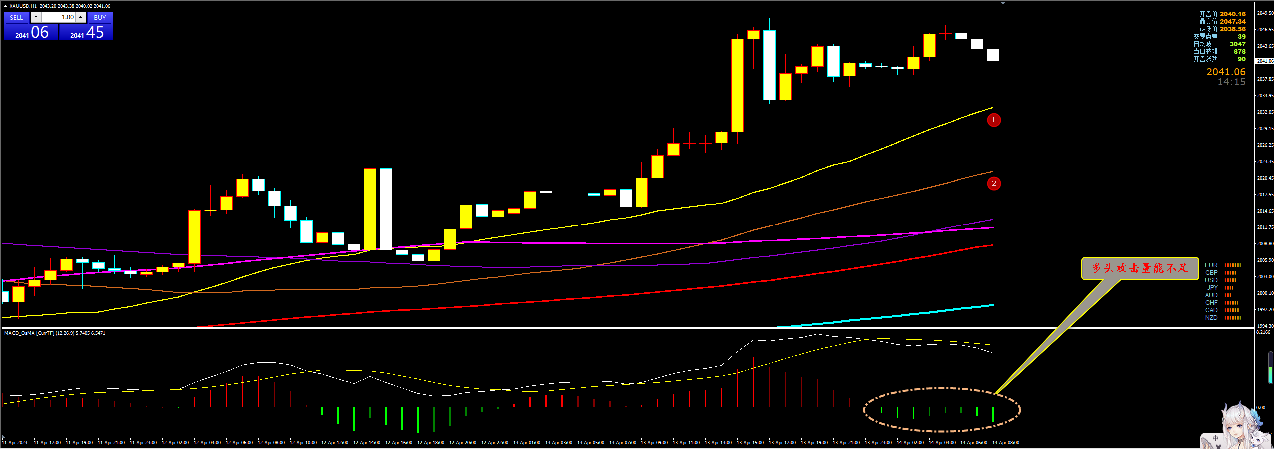 通过对黄金小时图解析得知,自从昨日晚间冲高回落以来一直在高位窄幅震荡调整虽然短期均线系统依然处于多头排列状态,但是下方MACD已经出现死叉迹象并且多头能量柱不足,但是整体依然是在零轴上方运行整体属于强势调整,短期下方我们重点关注12号均线的支撑,在操作上我们继续重点逢低做多,具体建议如下:
