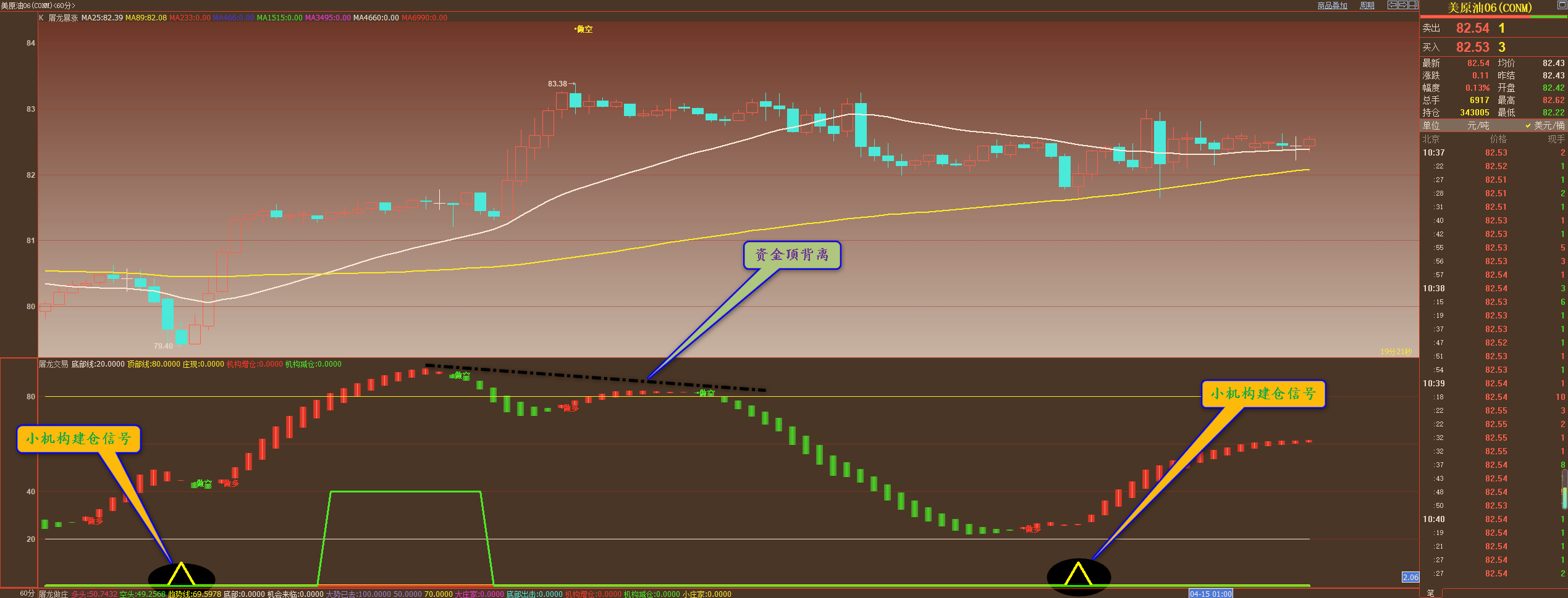 通过多原油小时图解析得知,上一个交易日依然是在高位窄幅震荡调整,从下方附图可以清楚的看到行情反弹到83.40一线出现了资金顶背离迹象从而导致行情的冲高回落动作,上周四到下方出现再次出现了小机构抄底信号,虽然目前有所上涨但是力道还有些不足资金流有些缩短,短期上方我们继续重点关注83.40一线的阻力位一旦放量突破并且站稳行情将会继续加速上行,短期上方我们继续重点关注85.20和86.90的压力即可,在操作上我们继续高空低多思路,具体建议如下: