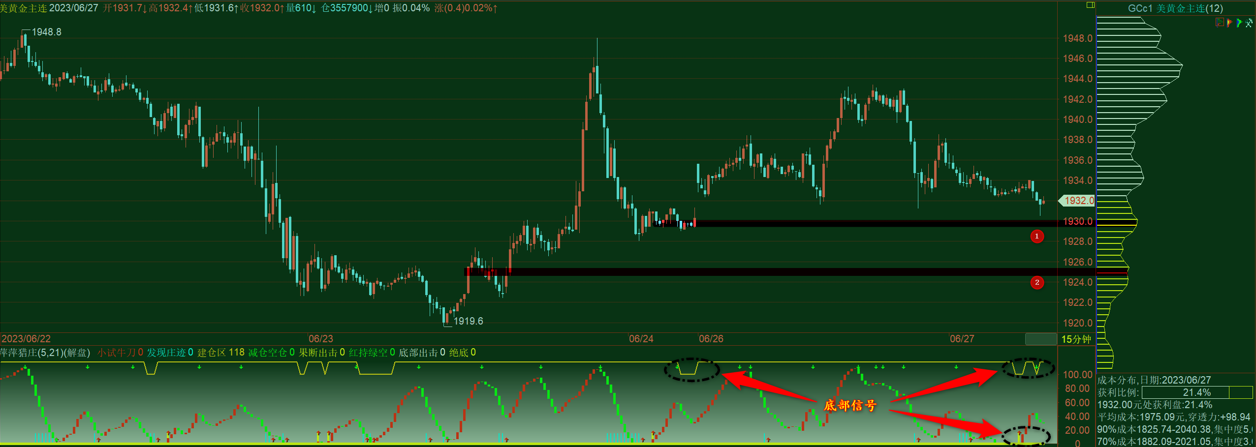 通过对黄金15分钟图解析得知,昨日行情反弹无力冲高回落,目前即将到达下方1号筹码峰的支撑位(附近),我们从下方的幅图中可以清楚地看到目前已经再次出现底部信号以及主力的进仓信号但是盘中不排除进一步下探到下方2号支撑位(1915附近),短期上方1935和1950一线依然是重要压力位,预期短期继续震荡调整的可能性比较大,但是不排除受数据影响或者突发事件影响打破区间震荡,在操作上我们继续先高空低多思路具体建议如下: