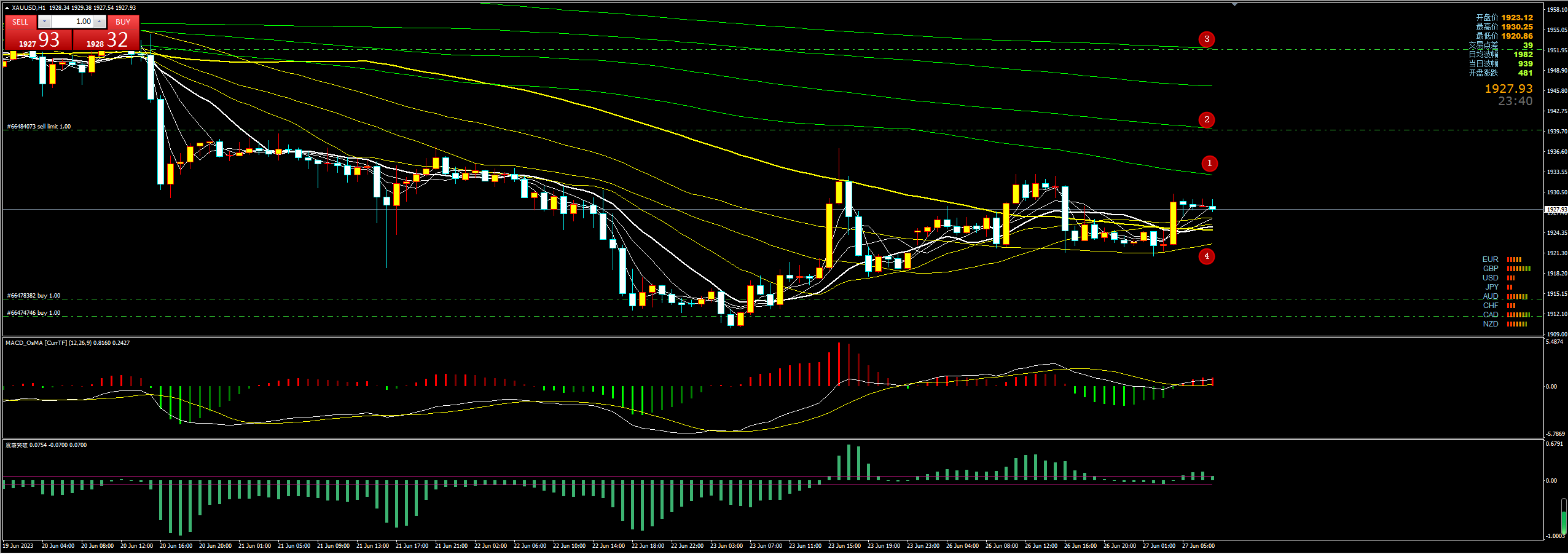 通过对黄金小时图解析得知,黄金从在下方4号均线支撑位得到关注反弹上涨,下方MACD也显示多头能量柱有明显放大迹象说明行情还要继续反弹上涨,短期上方我们重点关注123号均线的压力位,下方继续重点关注4号均线的支撑以及下方1915一线的启动上涨的位置支撑,从近期的几个交易日的走势来看有蓄势上涨的迹象,但是主图的均线系统依然是空头排列的状态短期整体属于超跌反弹行为,在操作上我们继续高空低多思路参与即可,具体建议盘中通知