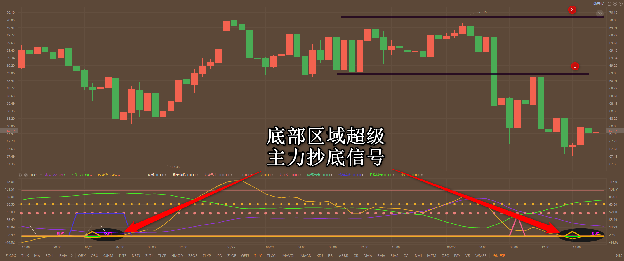 通过对原油小时图解析得知,昨日原油如期冲高回落再次到下方67.50一线短期形成震荡调整走势,昨日盘中放量跌破69一线,目前反过来以及成为短期的1号压力位,我们从下方的幅图可以清楚地看到上周回到下方67.40一线出现了底部信号以及超级主力抄底信号行情形成了一波强有力的反弹,今日早盘再次出现超级主力抄底信号预计将会继续形成强有力的反弹,盘中我们近期期待多头主力所带来的盛宴,在操作上我们继续高空低多思路,具体建议如下: