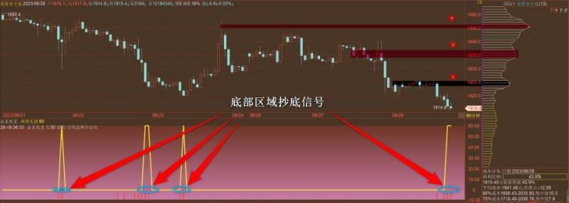 通过对黄金小时图解析得知,黄金从早盘到目前为止再次下探已经到达下方1906的位置目前还没有减速迹象非常有可能美盘时间段急速下探下方1890和1901一线的强支撑,我们从下方的附图可以清楚的看到前期在每一个阶段性底部区域都出现了底部买入信号盘子都出现了不错的反弹,目前现阶段再次出现底部买入信号相对而言也将会出现一波反弹行情,短期上方我们重点关注123号筹码峰值的压力即可,在操作上我们继续高空低多思路,具体建议盘中通知