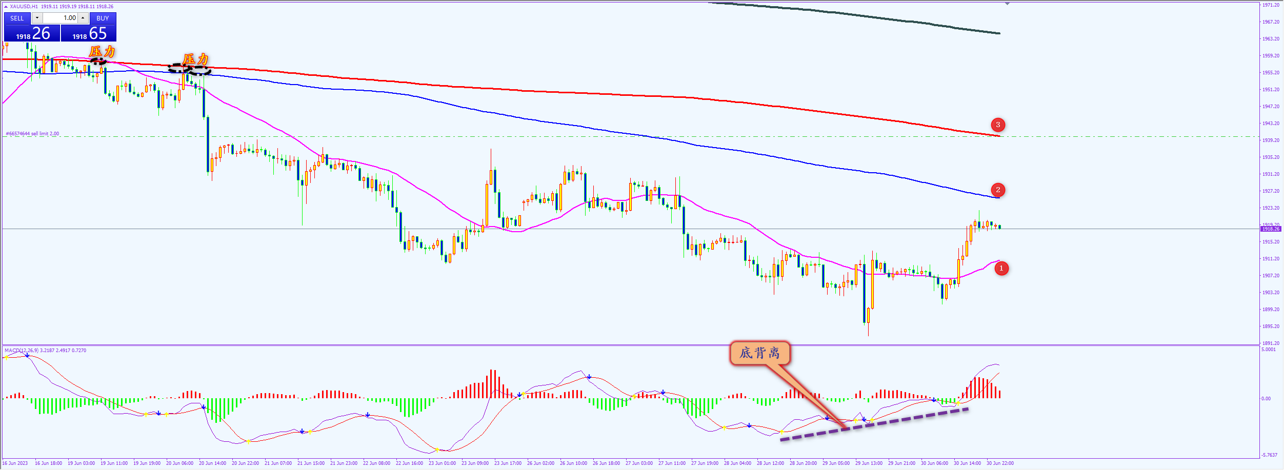 通过对黄金小时图解析得知,黄金如期再次在下方形成阶段性底部上周多次提醒有主力资金布局建仓,形成一波反弹属于正常现象,但是整体中期的调整还没有结束还没有形成上涨走势,上方依然受制于23号主要均线的压制(前期在上方1954和1959一线反弹无力被迫继续向下运行),我们从下方的MACD也可以看出行情创新低MACD逐步抬高也是说明有资金在底部区域进仓,目前下方1号均线已经构成支撑(1911附近)以及下方1901一线止跌的位置依然是短期的支撑,短期在操作上我们继续高空低多,具体建议如下: