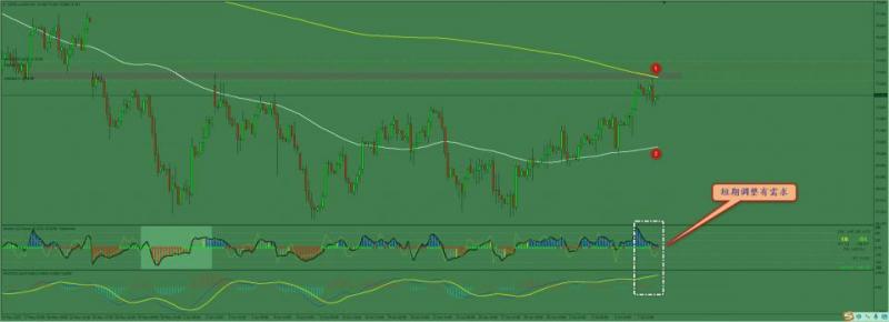 通过对原油小时图解析得知,昨日行情先涨后跌再次冲击到74.10一线(1号位)受阻回落,同时也是前期的制高点的位置相对而言也是有一定的压制作用,我们从下方的幅图可以看到CCI从高位回落已经接近零轴附近,下方MACD在高位形成死叉同时表明行情有回落调整需求,下方我们重点关注2号均线的支撑即可,短期在操作上我们继续高空低多思路,具体建议如下: