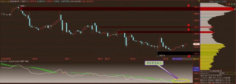 通过对黄金小时图解析得知,黄金从早盘到目前为止有小幅反弹动作,我们从下方的附图可以清楚地看到,在反弹的过程中只有一部分资金流入迹象但是还没有走强依然是在弱势区运行,短期下方4号支撑比较强烈,一旦放量跌破将会到达下方1860一线,短期上方我们继续重点关注1,23号的压力即可,短期在操作上我们继续高空低多思路,重点逢高做空,具体建议参考早盘策略即可