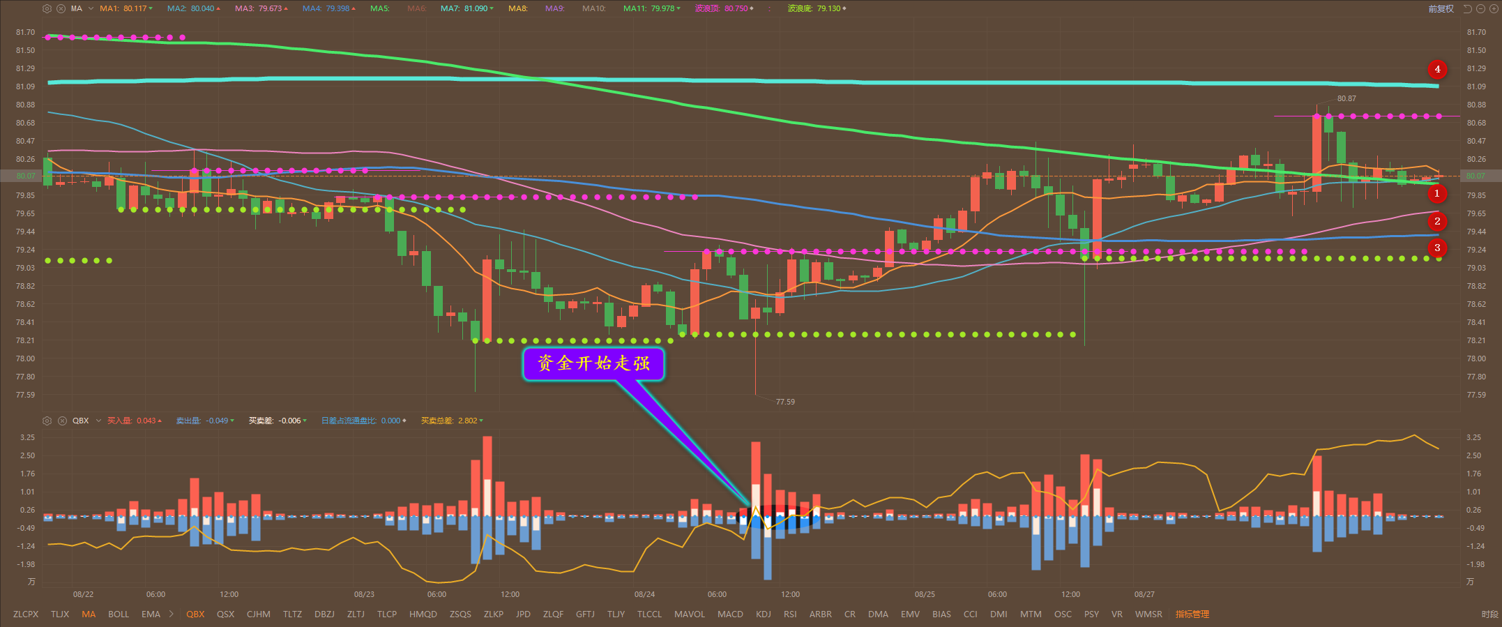 通过对原油小时图解析得知,昨日行情先跌后涨再下跌目前在下方1号均线的支撑位震荡盘整,行情之所以进一步的反弹上涨,除前两天说过的下方已经形成三针探底的形态,最主要的多头主力资金在第二次出现单针探底的时候就已经走强目前依然是在强势区运行,短期下方123号均线已经形成有力的支撑,但是上方依然是受到4号均线的压制一旦放量突破将会加速上涨,短期在操作上我们继续高空低多思路重点逢低做多,具体建议如下: