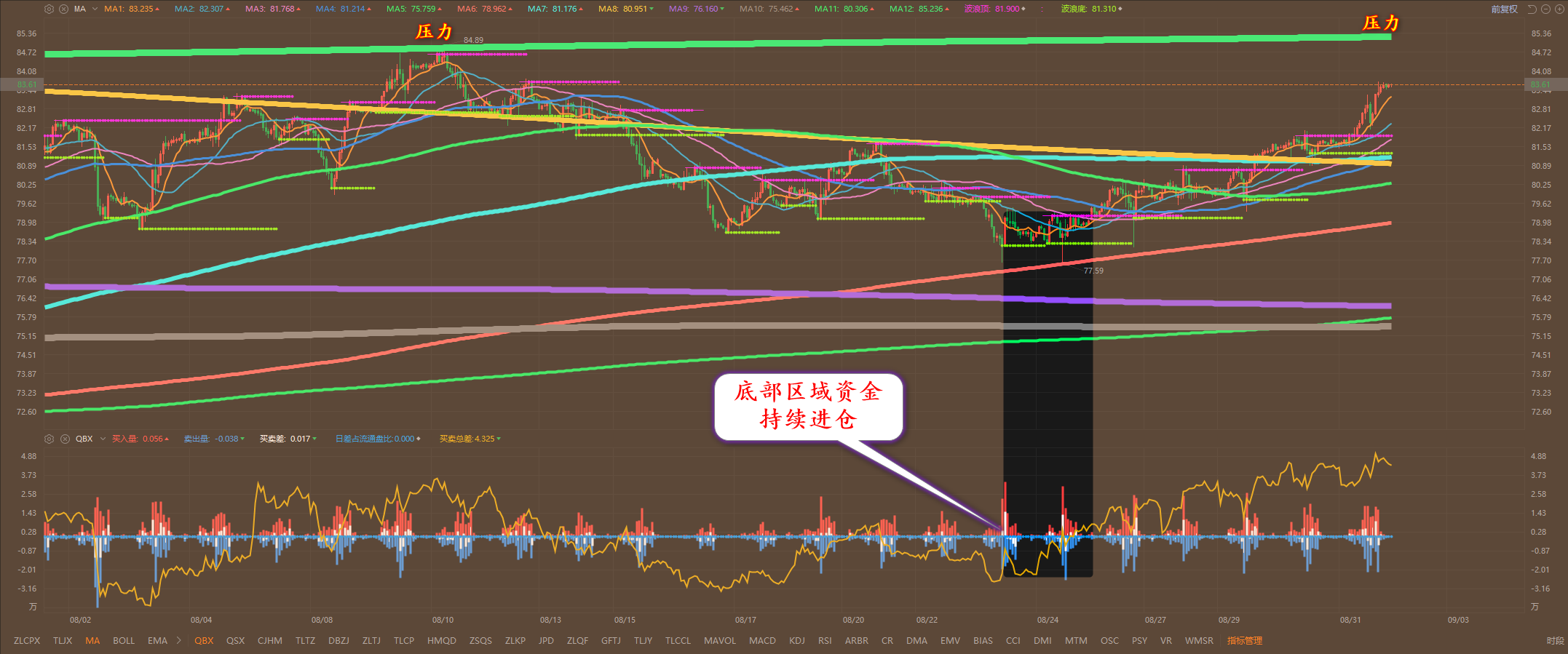 通过对原油小时图解析得知,昨日行情就震荡上行突破,上周就已经说过底部信号已经成立机会继续向上震荡上行,目前已经接近上一波的反弹高点位置附近以及高位均线的压力,下的雨也是有一定的压制作用的,行情之所以会出现一大波的反弹上涨我们从下方的幅图就可以清楚地看到在底部区域出现了大量的多头主力加仓动作一直加到现在接二连三的突破上方均线的压制。目前下方的所有均线都是支撑,短期继续震荡上行的可能性不变,回到下方均线支撑位我们继续参与多,具体建议如下: