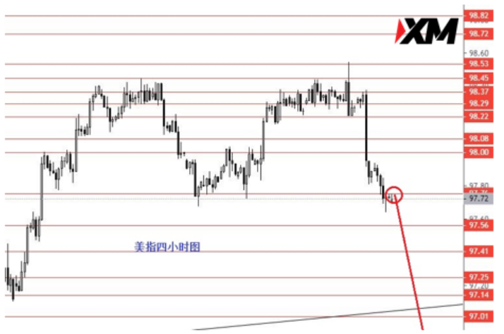 美指正如预期98.40承压向下回调,第二目标位97.75已到位。从图形来看,还是明朗的下跌趋势,今日继续做空美指,操作建议97.76区域做空,止损98.40,本周目标97.40和97.20区域,若能跌破97.20后再看向96.80区域。控制仓量,严格止损。