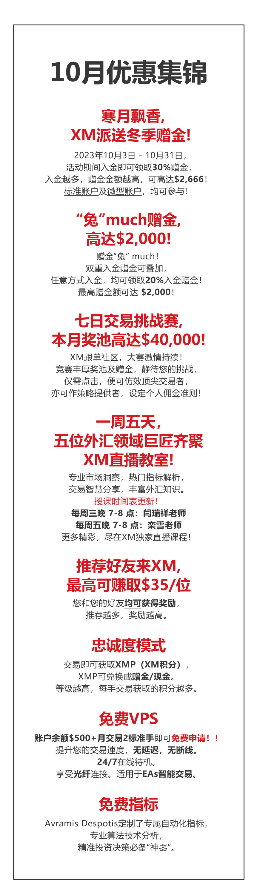 寒月飘香,XM派送冬季赠金!2023年10月3日 - 10月31日,入金即可领取30%入金赠金,高达$2,666!更有“兔” much双重赠金可叠加,20%入金赠金,高达$2,000!