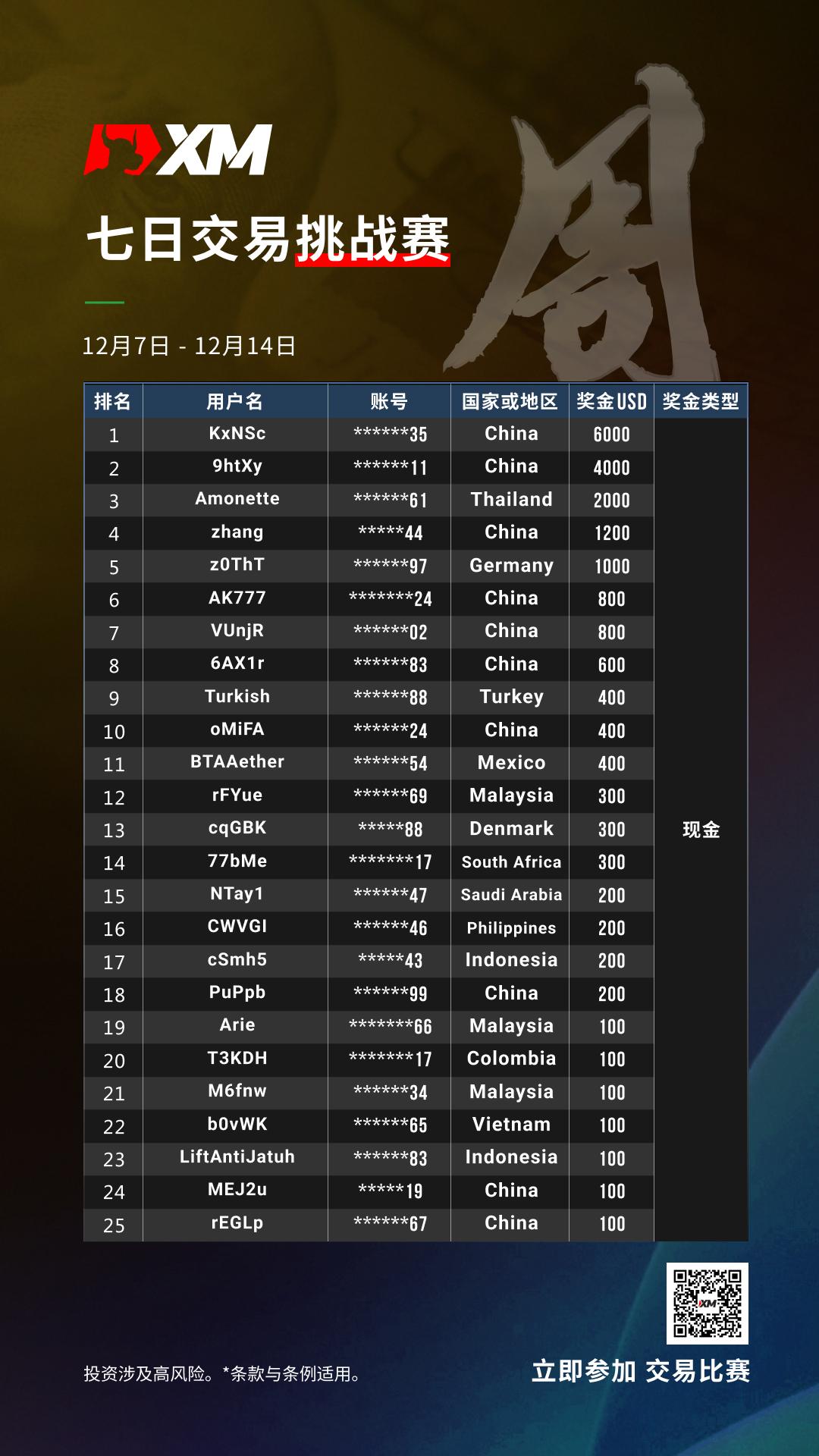 年末全球交易大赛第二回合结束,非常荣幸地宣布本次【七日交易挑战赛】的获奖者名单。参赛者不仅展现出卓越的交易技能,还表现出无与伦比的策略和决策能力。以下是本次比赛中,脱颖而出的交易者名单以及所获得的奖励: