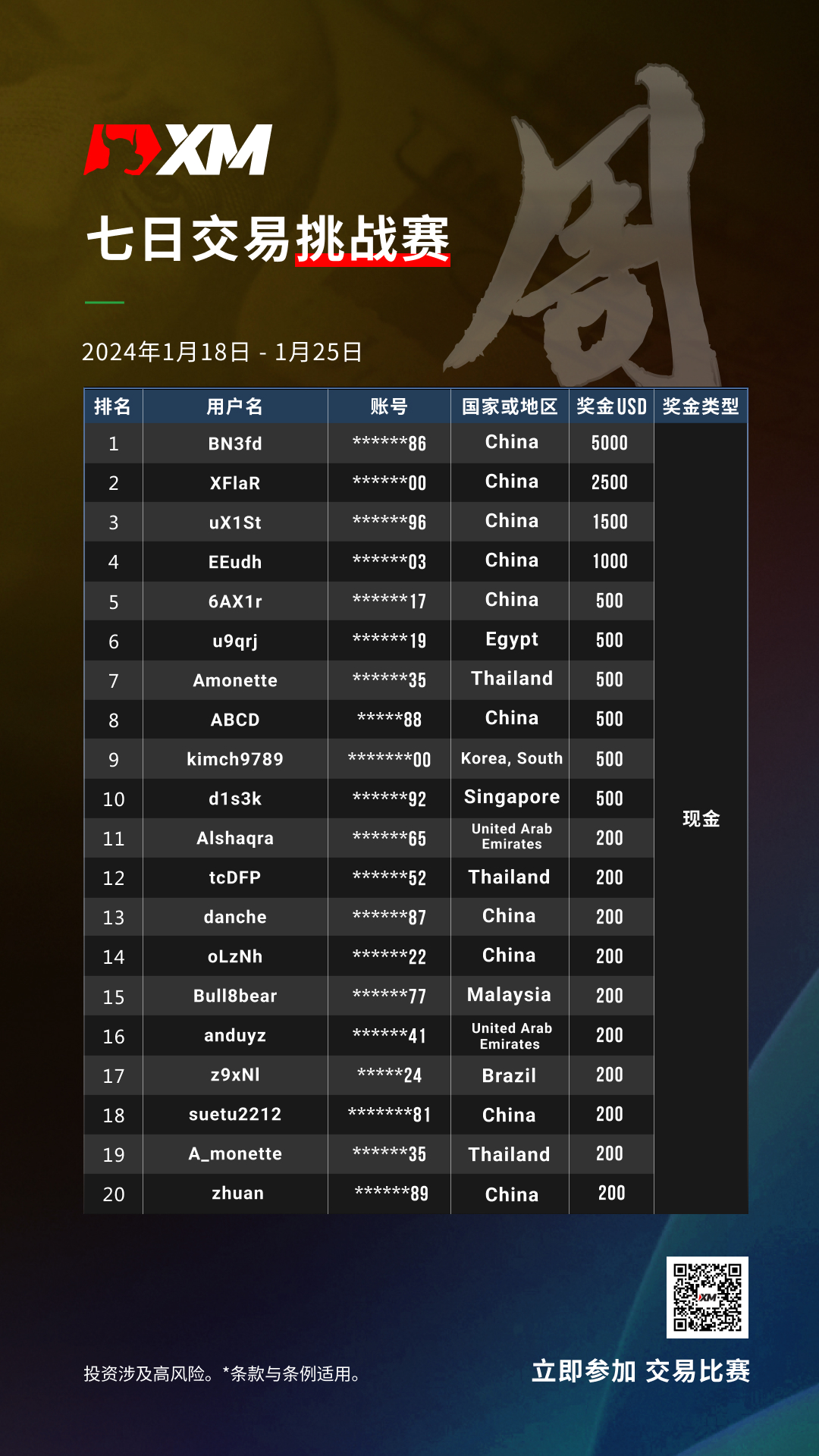 非常荣幸地宣布本次【七日交易挑战赛】的获奖者名单。参赛者不仅展现出卓越的交易技能,还表现出无与伦比的策略和决策能力。以下是本次比赛中,脱颖而出的交易者名单以及所获得的奖励: