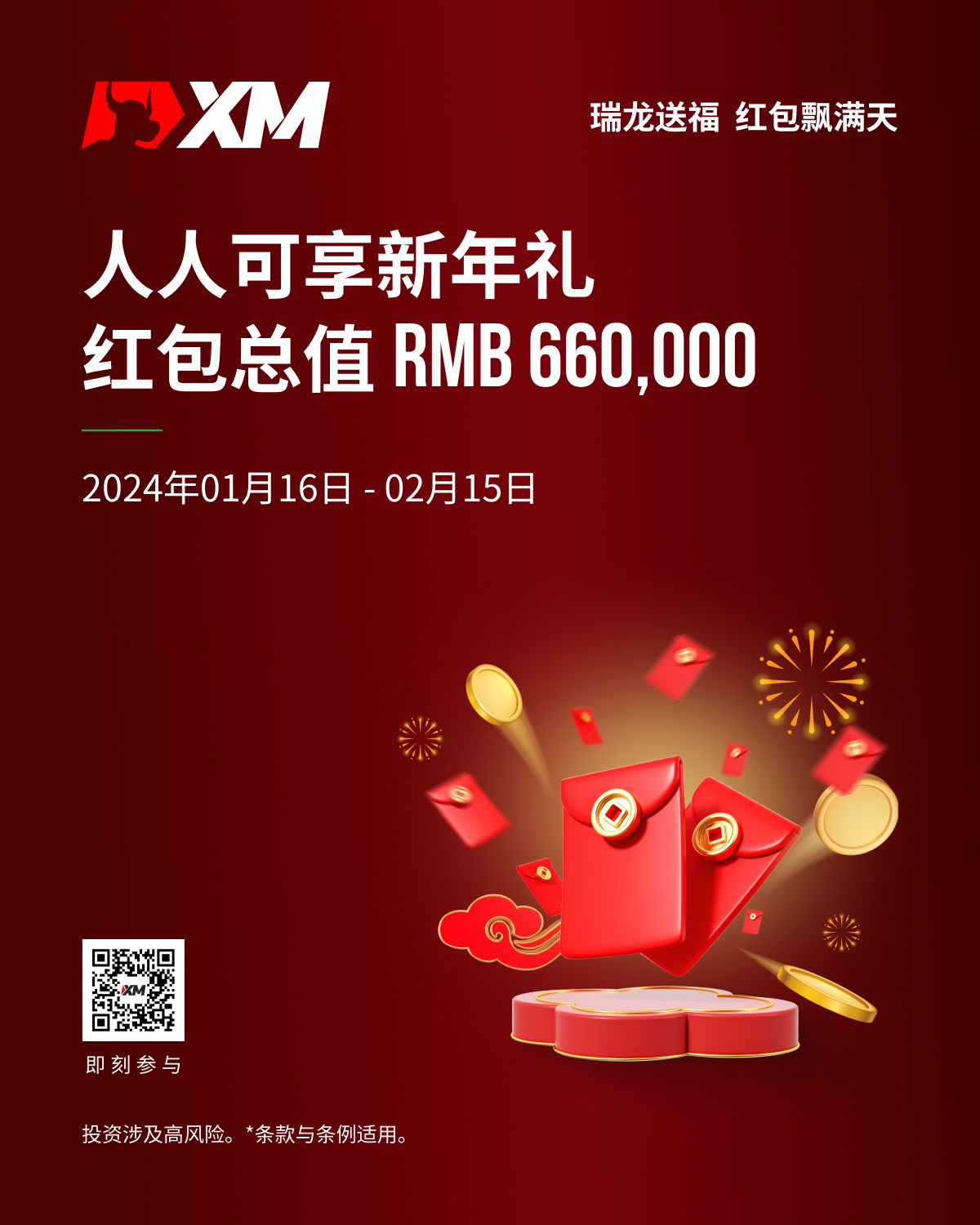 还没参与的客户,只要在2024年 2月15日前,交易至少 1 标准手(100 微型手)便可瓜分高达 RMB 600,000 新年红包,过上一个幸福丰收年!