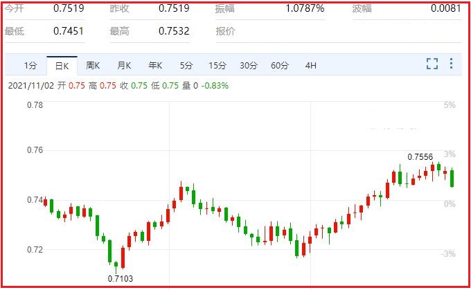 澳洲联储在11月2日周二宣布,维持利率在纪录低点0.1%不变,并表示继续每周购买40亿澳元的政府债券,至少到2022年2月中旬。但澳洲联储在声明中表示,取消2024年4月到期债券0.1%的国债收益率目标。澳洲联储表示,取消收益率目标的决定反映了经济状况的改善,以及通胀目标的实现比预期要早。鉴于其他市场利率已随着通胀上升和失业率下降的可能性增加而变动,收益率目标在抑制澳大利亚利率总体结构方面的有效性已经减弱。与此同时,澳洲联储表示,准备好保持耐心。加息条件可能需要一段时间才能到达。澳洲联储在声明中表示:尽管通胀有所抬头,但从基础通胀率来看,目前依旧处于低水平。通货膨胀的压力也比其他许多国家要小,这不仅仅是因为澳大利亚工资的温和增长。在实际通胀持续保持在2%至3%的目标范围内之前,委员会不会加息。汇价现报0.7457,跌幅0.87%。