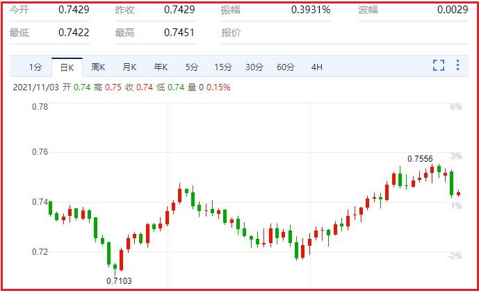 美东时间11月3日周三,美国联邦公开市场委员会(FOMC)将公布利率决议。鲍威尔在最近一次讲话中明确表示,“现在是缩减购债的时候,但不是加息的时候”,美联储正步入很快开始逐步taper的轨道,预计2022年年中7月份左右完成这一过程。财政部原本在上月宣布,准备大幅增加国债发行规模,其三个月和六个月的票据拍卖规模将自3月份以来首次增加。但据彭博报道指出,随着美联储taper步伐的临近,美国财政部预计将宣布缩减其庞大的长期债券出售规模,总规模达1万亿美元,这将是5年多来的首次。分析指出,随着时间的推移,美国财政部缩减债券发行的规模,将超过美联储缩减国债购买的规模。如果今晚美联储议息会议透露明确的调息信息,那么澳元恐要继续遭到抛售的压力。汇价现报0.7441,涨幅0.10%。