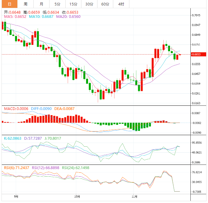 今天的预期交易区间在支撑位0.6560和阻力位0.6680之间。