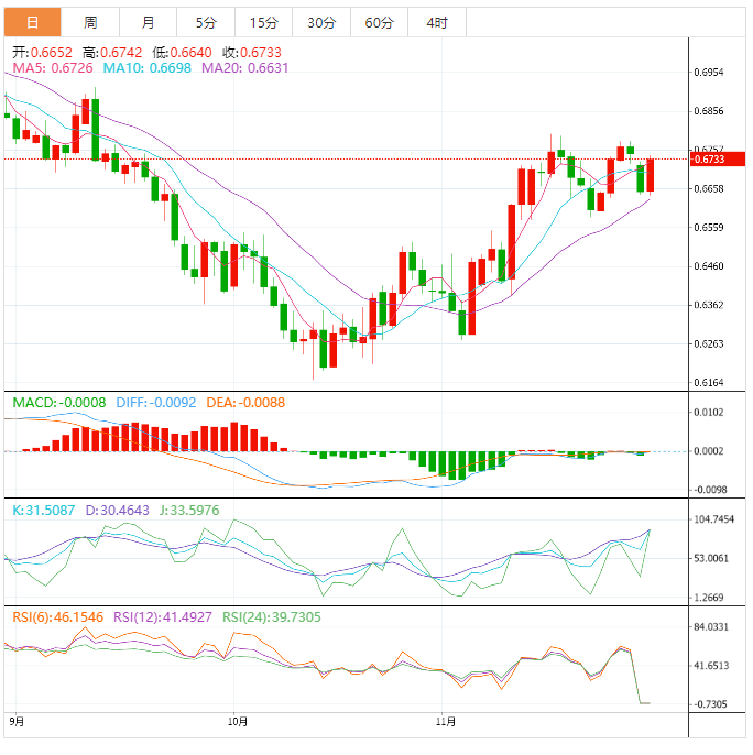 今天的预期交易区间在0.6650支撑位和0.6780阻力位之间。