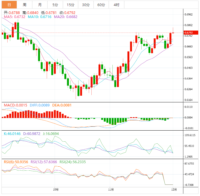 周四盘中,澳元兑美元上涨至0.6793,涨幅0.07%。