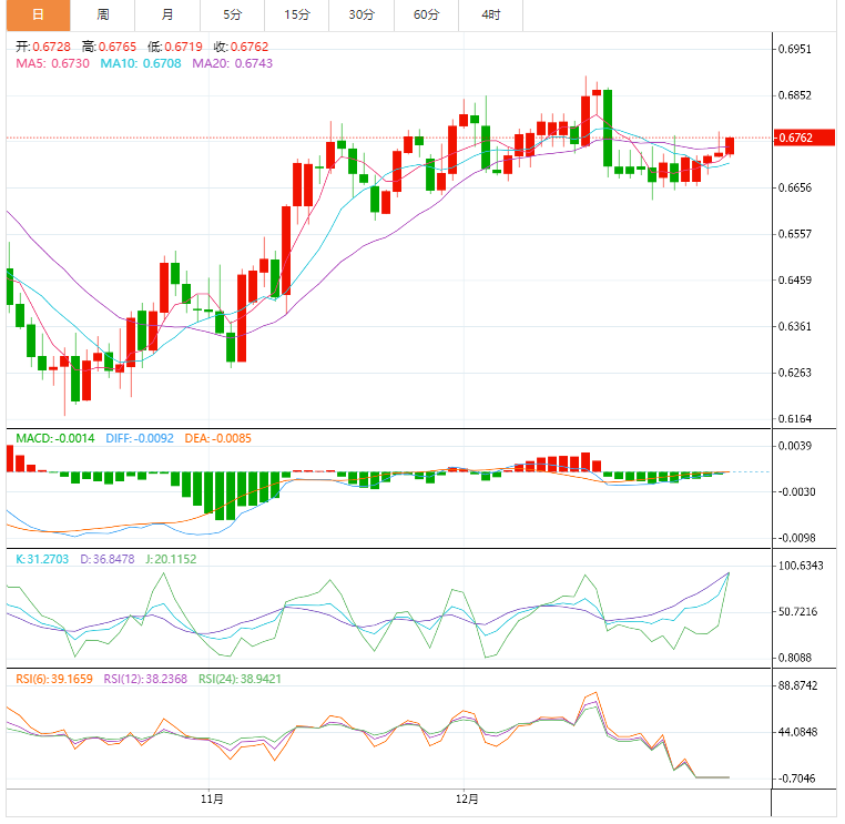 周三盘中,澳元兑美元上涨至0.6763,涨幅0.45%。