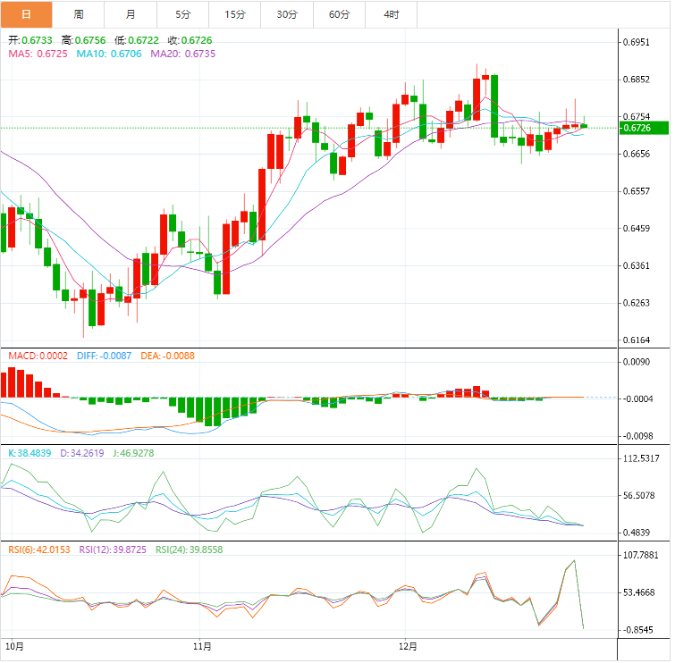 周四盘中,澳元兑美元下跌至0.6727,跌幅0.12%。