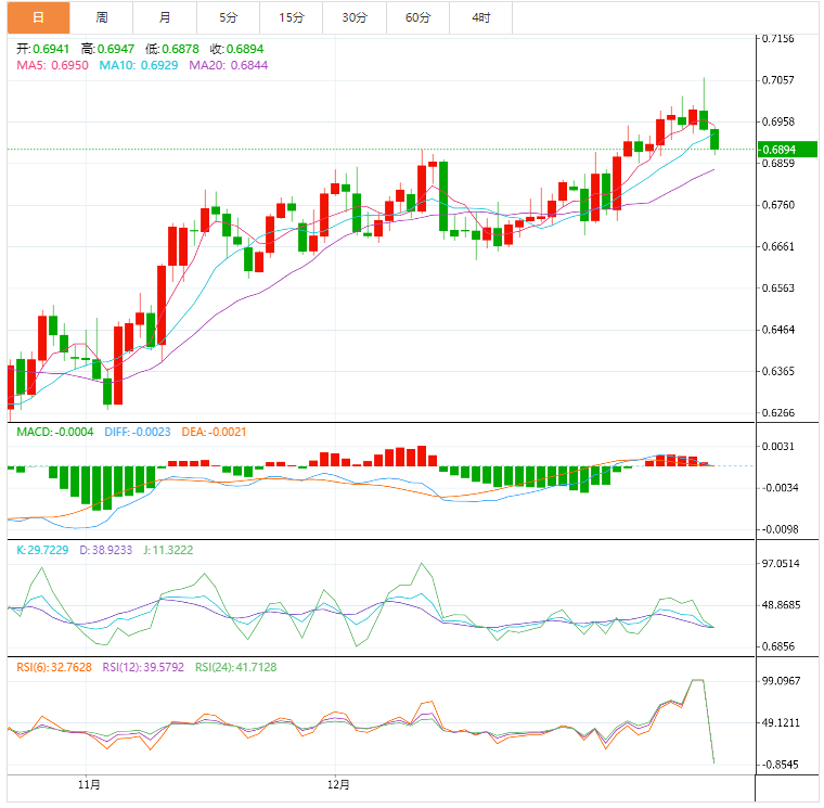 周四盘中,澳元兑美元下跌至0.6895,跌幅0.66%。