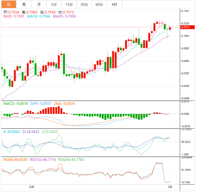 今天的预期交易区间在0.7010支撑位和0.7140阻力位之间。