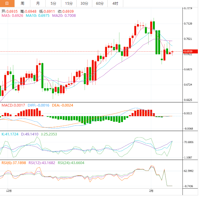 周五盘中,澳元兑美元上涨至0.6941,涨幅0.06%。