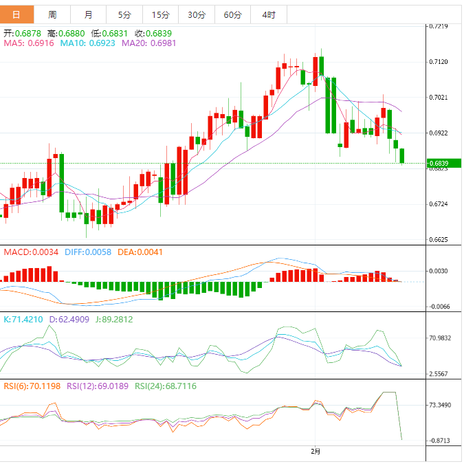 周五盘中,澳元兑美元下跌至0.6841,跌幅0.57%。