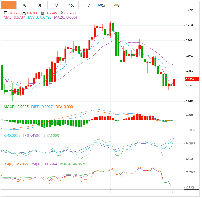 今天预期的交易区间在0.6670支撑位和0.6780阻力位之间。