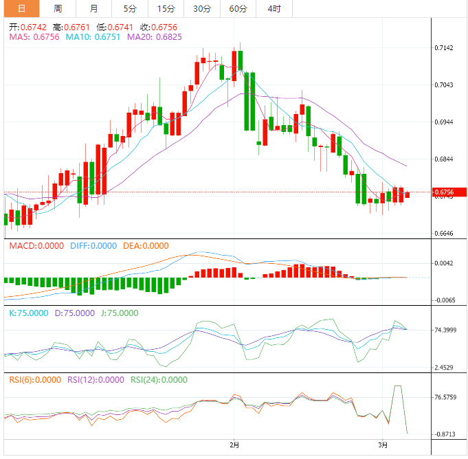 如果澳元兑美元多头成功守住了0.6825的驾驶座,那么不排除澳元上涨至2月中旬高位0.7030附近的可能性。值得注意的是,0.7000整数可以作为0.6825和0.7030之间的缓冲。