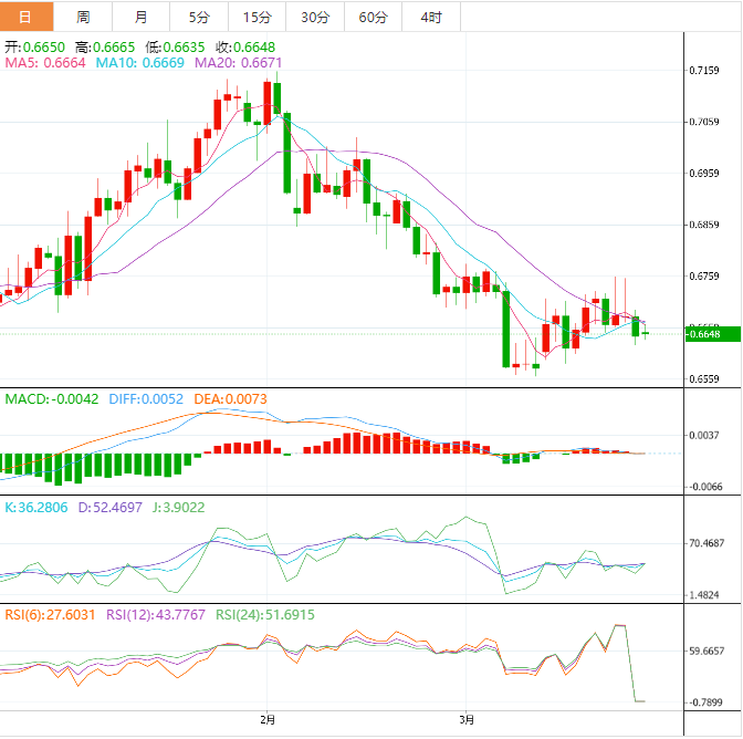 今天预期的交易区间在0.6570支撑位和0.6690阻力位之间。